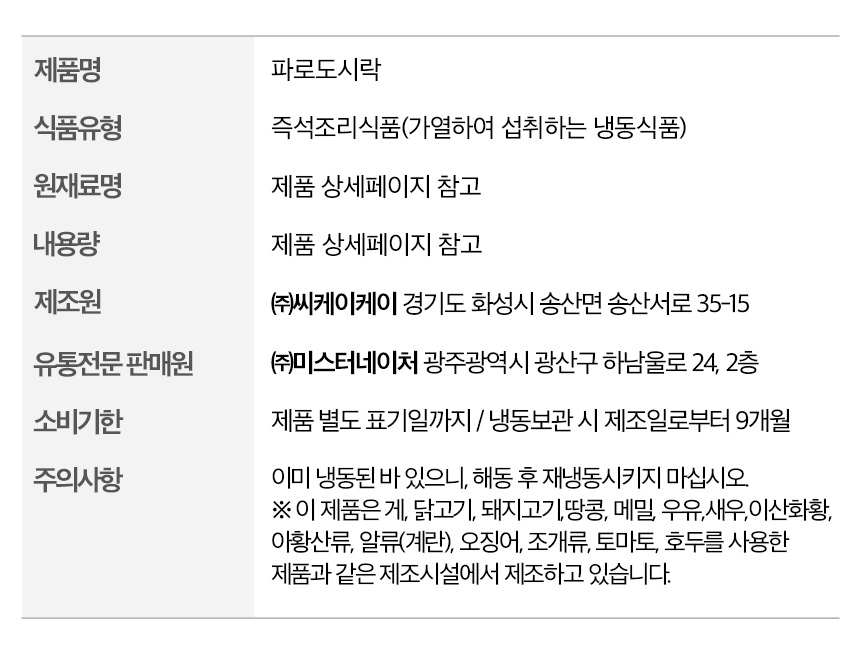 | 원재료명 (「농수산물의 원산지 표시 등에 관한 법률」에 따른 원산지 표시 포함) 및 함량 | 상세페이지 참고 | ||